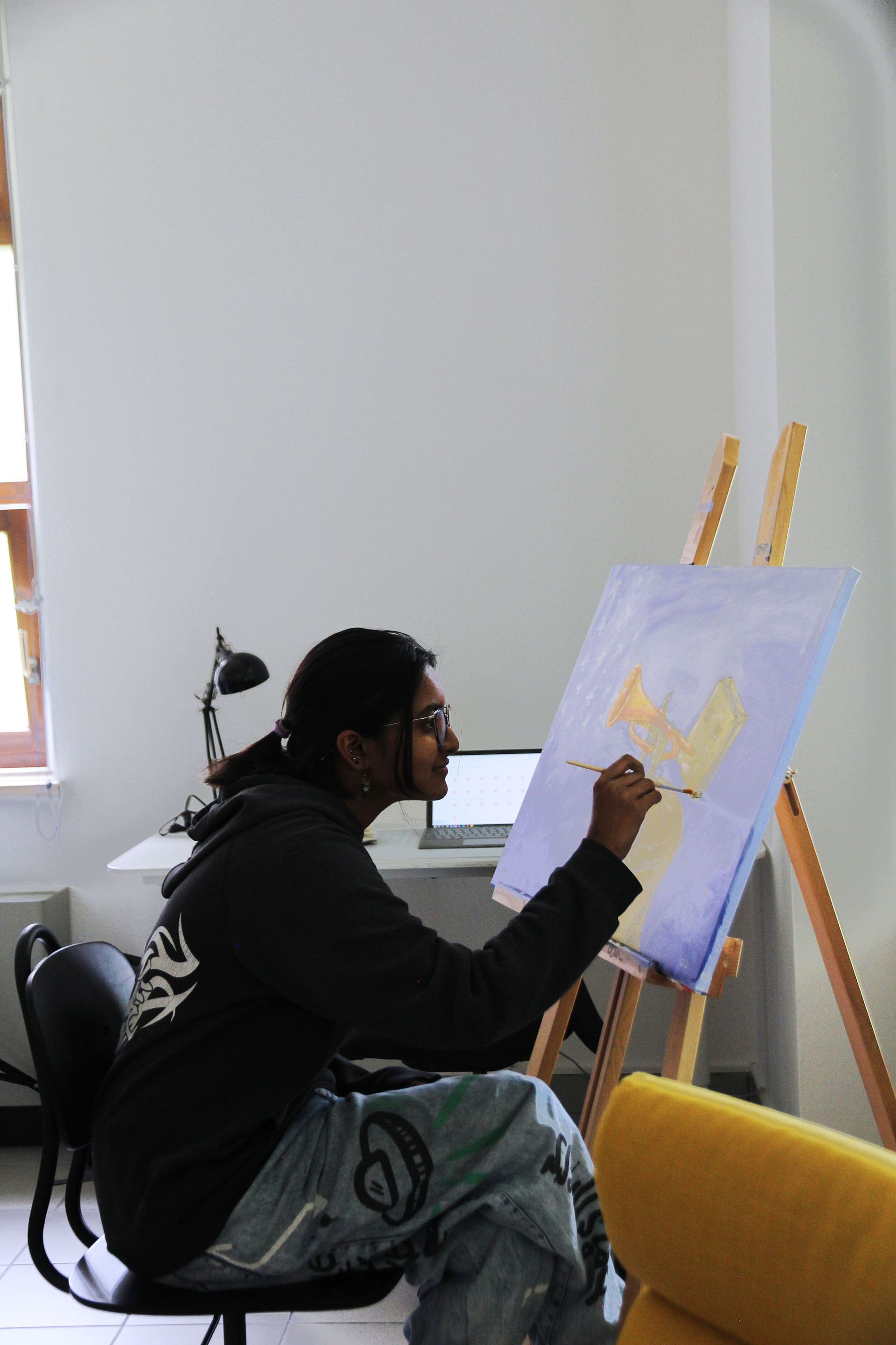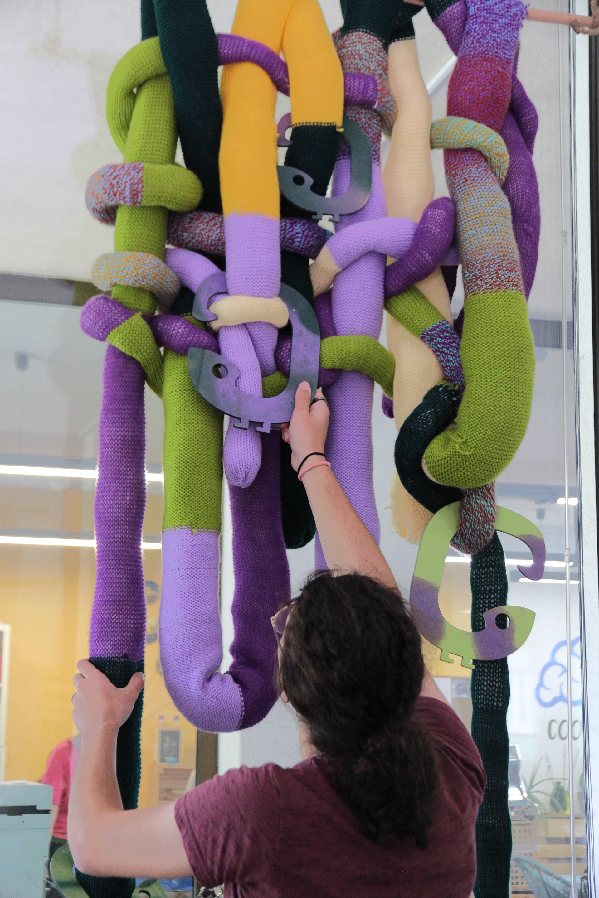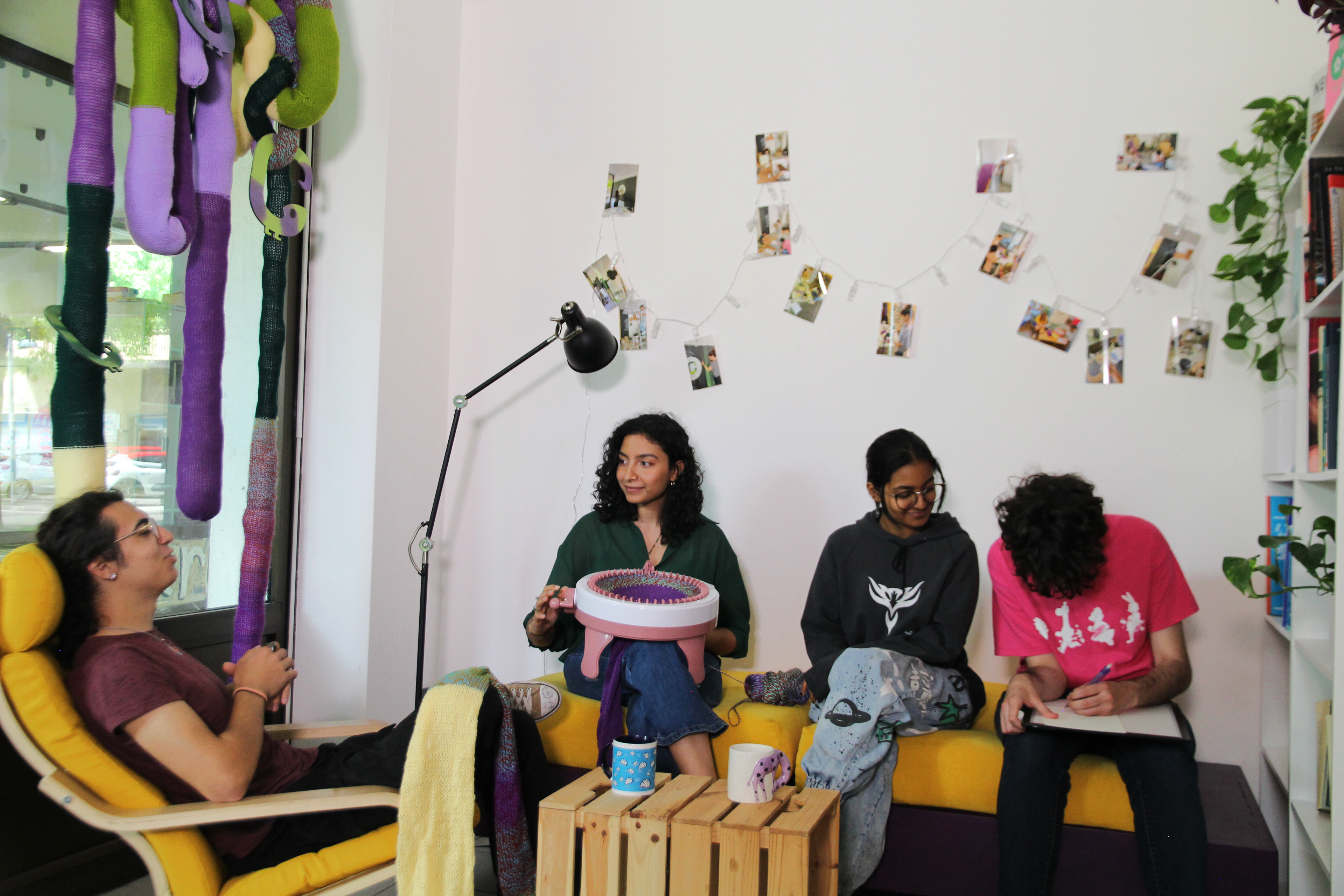 A standout feature is the acoustic knitting installation: a vibrant wool “jungle” made in collaboration with the youth. It improves sound quality and provides a playful visual barrier for the street-facing windows, balancing privacy with natural light.